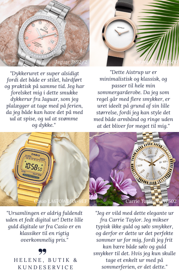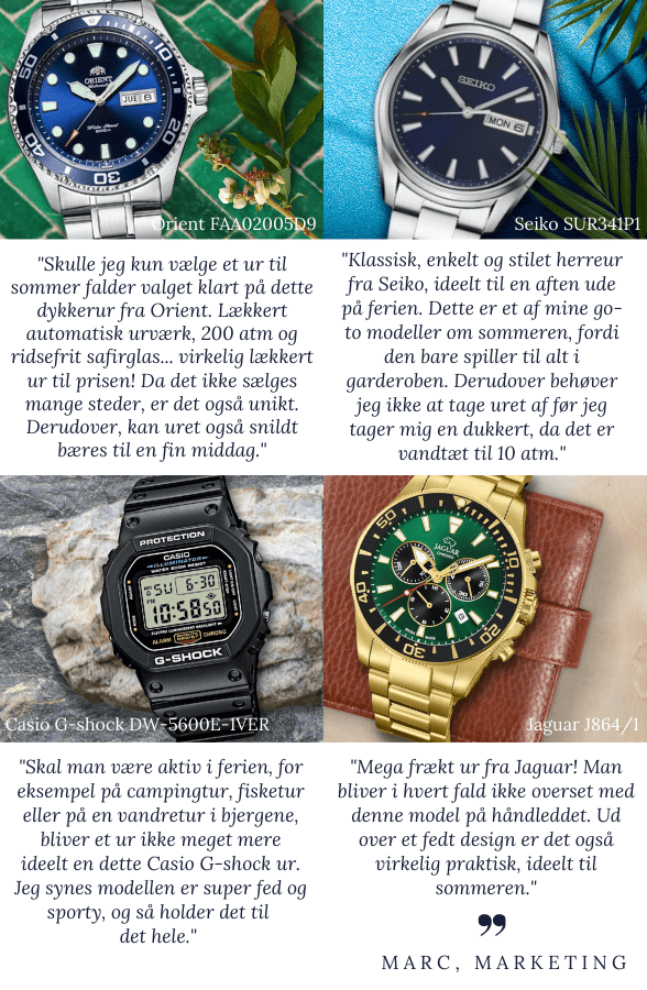Til mænd og kvinder har vi blandt andet udvalgt modeller som kan sætte prikken over i’et til sommer outfittet, samt kan bæres til en lækker middag på rejsen til de varme lande. Vi har udvalgt cool og praktiske dykkerure, som både ser godt ud på håndleddet, og som kan tages med på en dukkert i havet eller poolen. Derudover finder du cool og hårdføre digitale ure med praktiske funktioner, som de perfekte følgelsvende på en vandretur i bjergene. Til børn har vi blandt andet udvalgt modeller i materialer der sidder let og behageligt på håndleddet i sommervarmen. Ligeledes har vi udvalgt modeller med praktiske egenskaber, som for eksempel vandtæthed, så barnet ikke behøver at tage uret af inden det hopper i vandet.